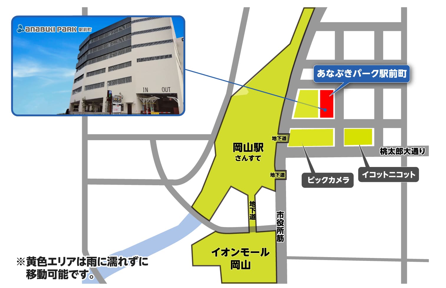 強い日差しを避け、雨にぬれずに岡山駅前を広範囲に移動できます。